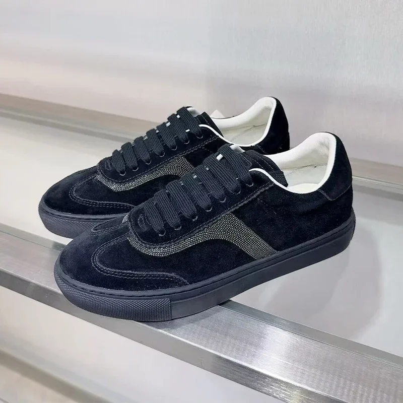 Suede String Bead Thick Sole Casual Shoes Women Round Toe Lace Up Flat Shoes Leisure Sneakers Spring Autumn Comfort Tennis Shoes